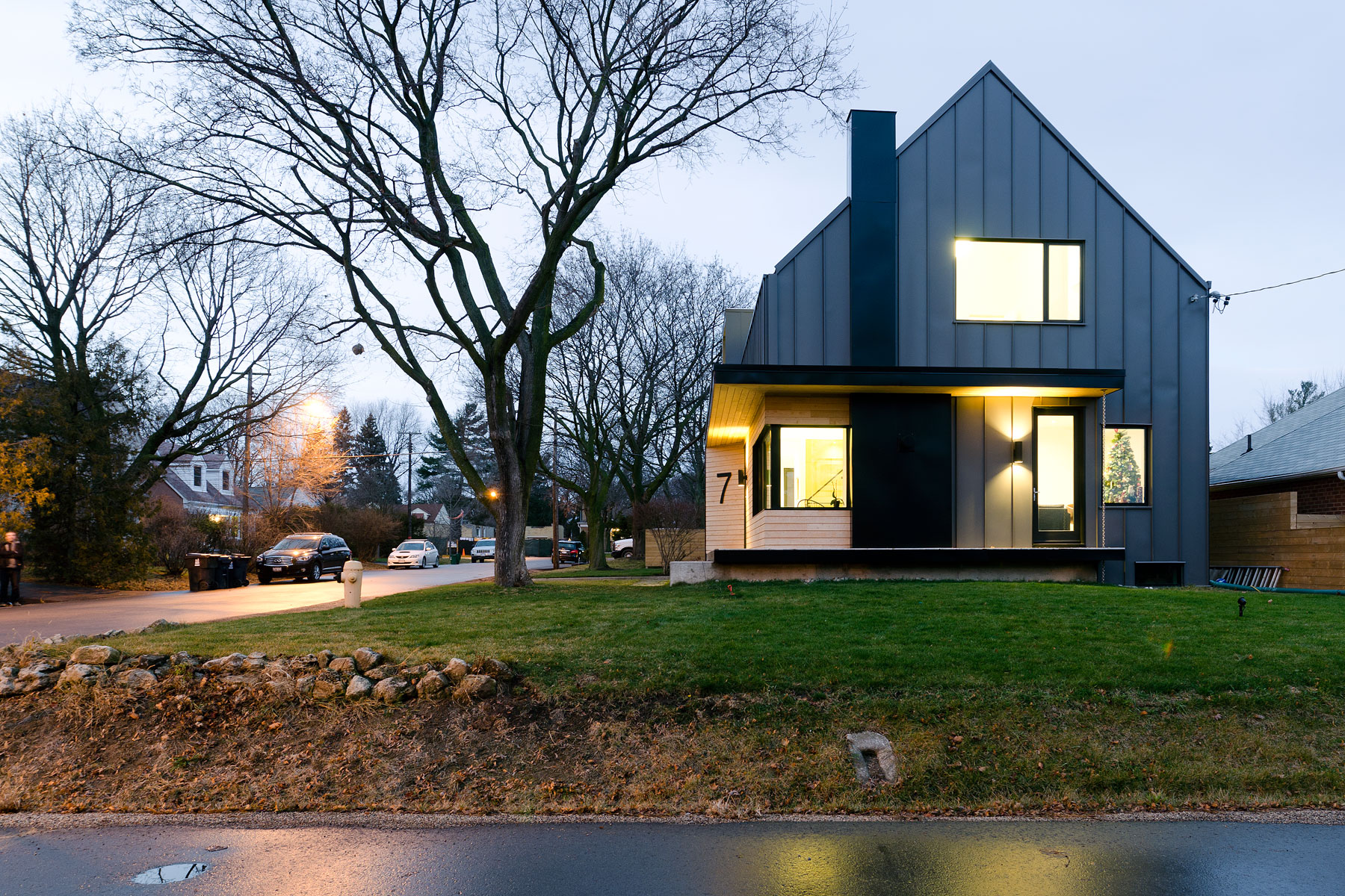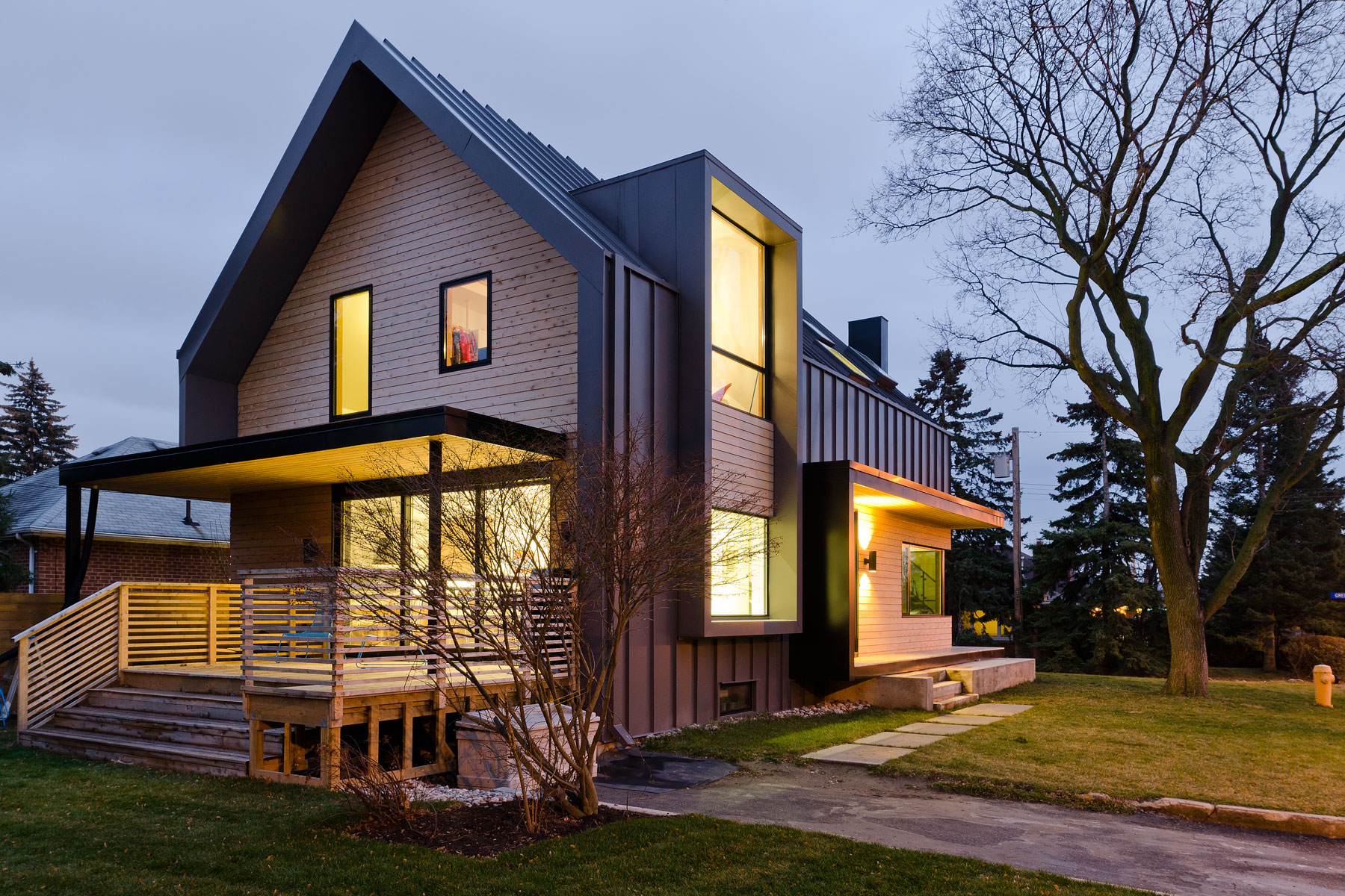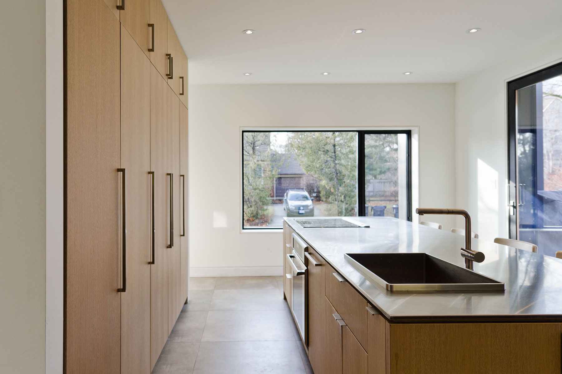 These three divisions enabled us to implement an ordered and logical programme to each floor plate; it was simply a case of then applying the same logic and restraint to the massing of the building so to integrate the home within its environment, embracing a similar mass and volume to that of its neighbours. However, this more modern interpretation is devoid of brick, stone, asphalt shingles, small exterior punched openings and dark interior spaces, and instead opts for a more refined and contemporary palette of poured concrete, white cedar and standing seam metal.