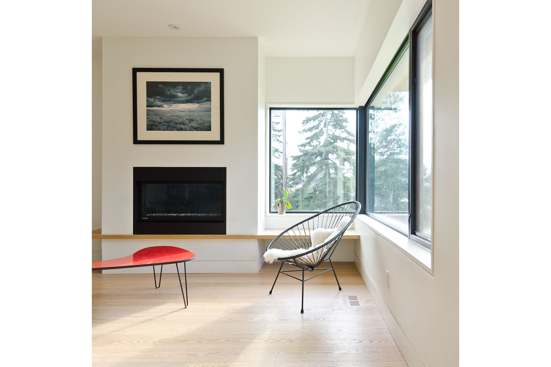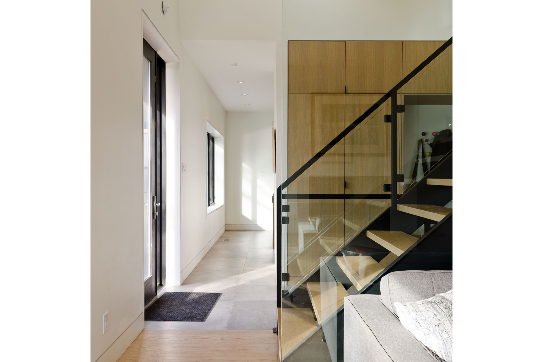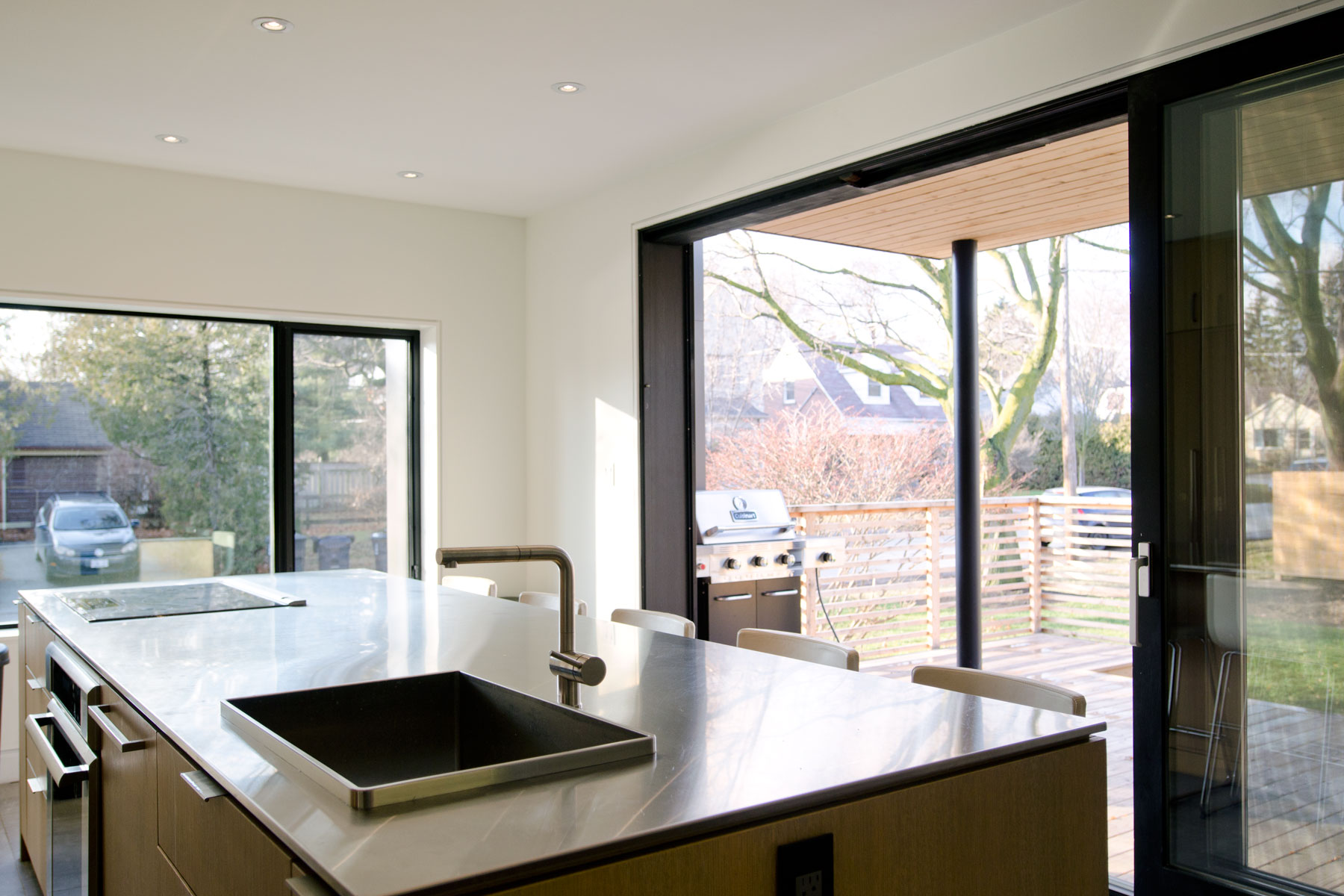 These three divisions enabled us to implement an ordered and logical programme to each floor plate; it was simply a case of then applying the same logic and restraint to the massing of the building so to integrate the home within its environment, embracing a similar mass and volume to that of its neighbours. However, this more modern interpretation is devoid of brick, stone, asphalt shingles, small exterior punched openings and dark interior spaces, and instead opts for a more refined and contemporary palette of poured concrete, white cedar and standing seam metal.