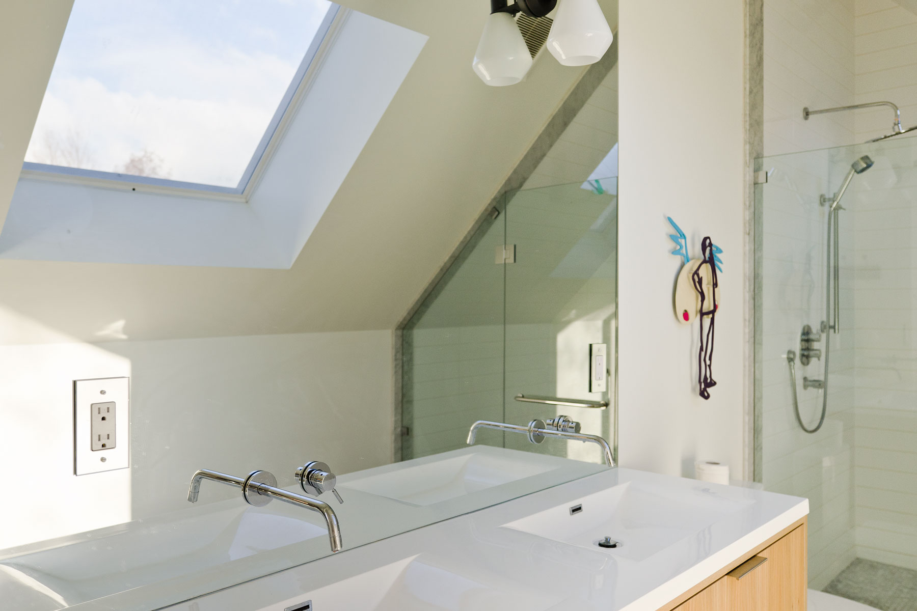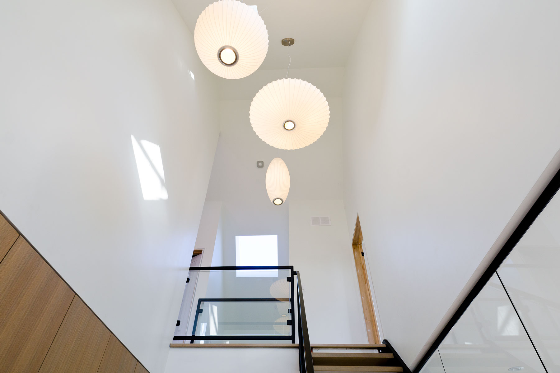 The first and most northerly slice is home to the kitchen and dining area to the ground floor, with the kids bedrooms above, all of which address the rear yard; a laundry room and shared bathroom are located internally adjacent to these spaces. The second and most central slice acts as the buildings spine, which is occupied by the main entrance, storage closets, a powder room and the vertical circulation path which ties the basement and second floor catwalk to the main entry hall; large skylights from above draw natural light in, in turn helping maintain a light filled building core. The third and most southerly slice sees the introduction of a living room and study to the ground floor, with a master suite over top, all of which address more expansive vista’s beyond the confines of the lot.